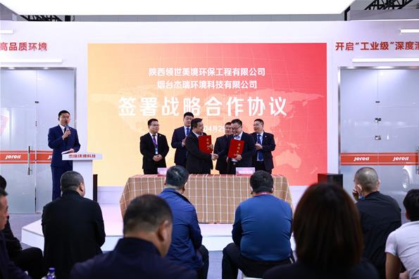 在展会现场,杰瑞环境科技与陕西领世美境环保工程有限公司签署战略合作协议,双方将就陕西的城市生态环境建设、道路深度保洁等领域展开深度合作。