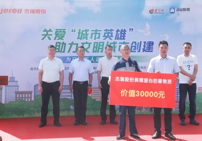 在此次活动中,杰瑞向环卫工人送去了总价值3万元的瓶装矿泉水和便携水杯、冰袖等清凉物资,叮嘱他们夏季炎热,做好防暑降温,并由衷地感谢环卫工人们为城市整洁作出的贡献,让他们真切地感受到来自社会和企业的关爱与温暖。
