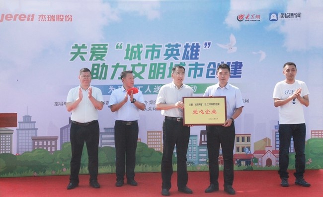 大暑已至,骄阳似火,热浪袭人。为关爱环卫工人,7月25日上午,由中共烟台市委宣传部、烟台市文明办、烟台市城市管理局、山东省互联网传媒集团·大众网指导,杰瑞股份携手大众网烟台在烟大广场共同举办关爱“城市英雄”助力文明城市创建活动,为环卫工人送上夏日清凉。烟台市文明办副主任吕忠民,烟台市环卫中心主任杨新慈,大众网烟台站站长冯炜程,杰瑞股份副总裁曲林和杰瑞工业科技集团环境事业部总监郭伟明以及环卫工人代表参加了活动。